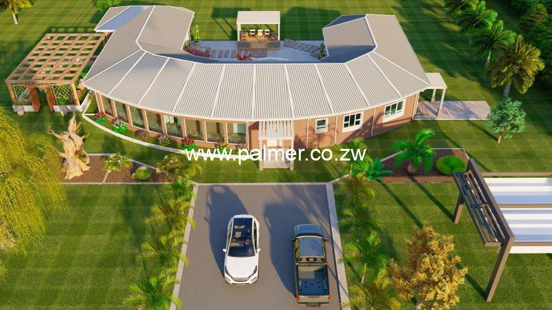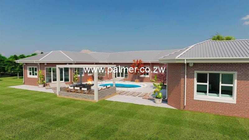 3 bedroom house plan for low density stands ranging between 188m2 and 2000m2 with a neat hipped roof design. Features include traditional concrete roof tiles cover and jointed/pointed brick walls. Has aluminum sliding doors, frames and tinted glass right round. Design is unique and resembles a cow horn setup with  swimming pool in the middle.