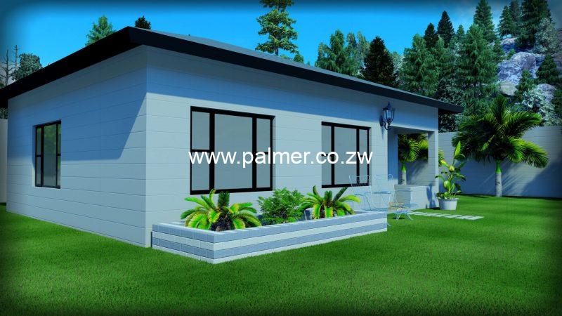 4 bedroom high density house plan with a hipped roof design. Can sit on a 120m2 stand. Features include green qtiles roof cover and plastered walls. Has aluminum and tinted glass right round